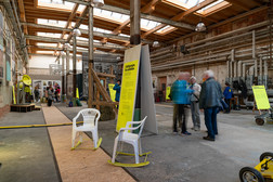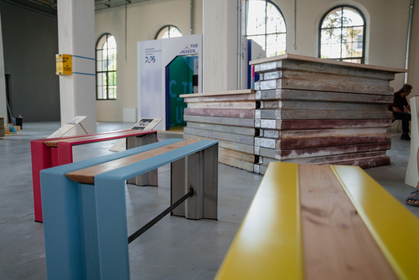 Funnels, index cards, messages hidden in print, rocking chairs and counters made from discarded garage doors. In 2024, students from Burg Giebichenstein University of Art and Design Halle designed objects for the #3000Garage trail that conveyed the local stories of Chemnitz's garage yards. Two selected designs were realised at ten stations on the trail. Counters and rocking chairs, which were created as part of the research project, served as functional parts of the exhibition architecture, funnels and index cards were shown as exhibits and created a connection to the garage trail in public space.