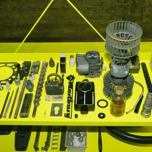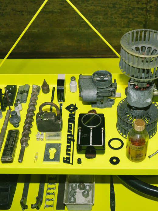 Martin Maleschka encountered many expected objects in garage yards: Cars, two-wheelers, the contents of entire workshops, but also surprises time and again: the youth club furnished with discarded furniture, the faded postcard collection, crazy arrangements of carpet remnants on the walls, etc. Garages are often used to store personal memorabilia that are linked to people, situations or contemporary history. Sometimes the garage becomes a quasi-museum cabinet, a personal archive in which time seems to have stood still. Here you can still see the "Oh, that's possible again" of the GDR's economy of scarcity, posters with scantily clad beauties from the 1990s beckon, and often the latest VW Polo is parked in between. Garages are places of simultaneity of the non-simultaneous, ambivalent spaces. This is what makes them so exciting. Their architecture tells stories and the things stored in them, which go far beyond the car, do the same. Martin Maleschka listens to them. He questions people, things and places. His "Ersatzteillager" (Spare Parts Warehouse) is the result of a synopsis of these stories, impressions of places and objects. Sometimes they are small, inconspicuous things from everyday life in the garage, sometimes objects with emotional value: from sealing rings to home-made tools to a pile of issues of "Football Week". Martin Maleschka was able to compile this insight into the world of things in the local garages through brief encounters and long conversations, sometimes requiring a little persuasion to briefly release an object from his personal garage archive into the world of art. Just like the performative collection actions themselves, the staging conveys that garages, the things stored, honoured or used in them and the stories associated with them are a valuable everyday cultural treasure. It's time to give it our attention: Clear the stage for the garage things in the "spare parts warehouse"!