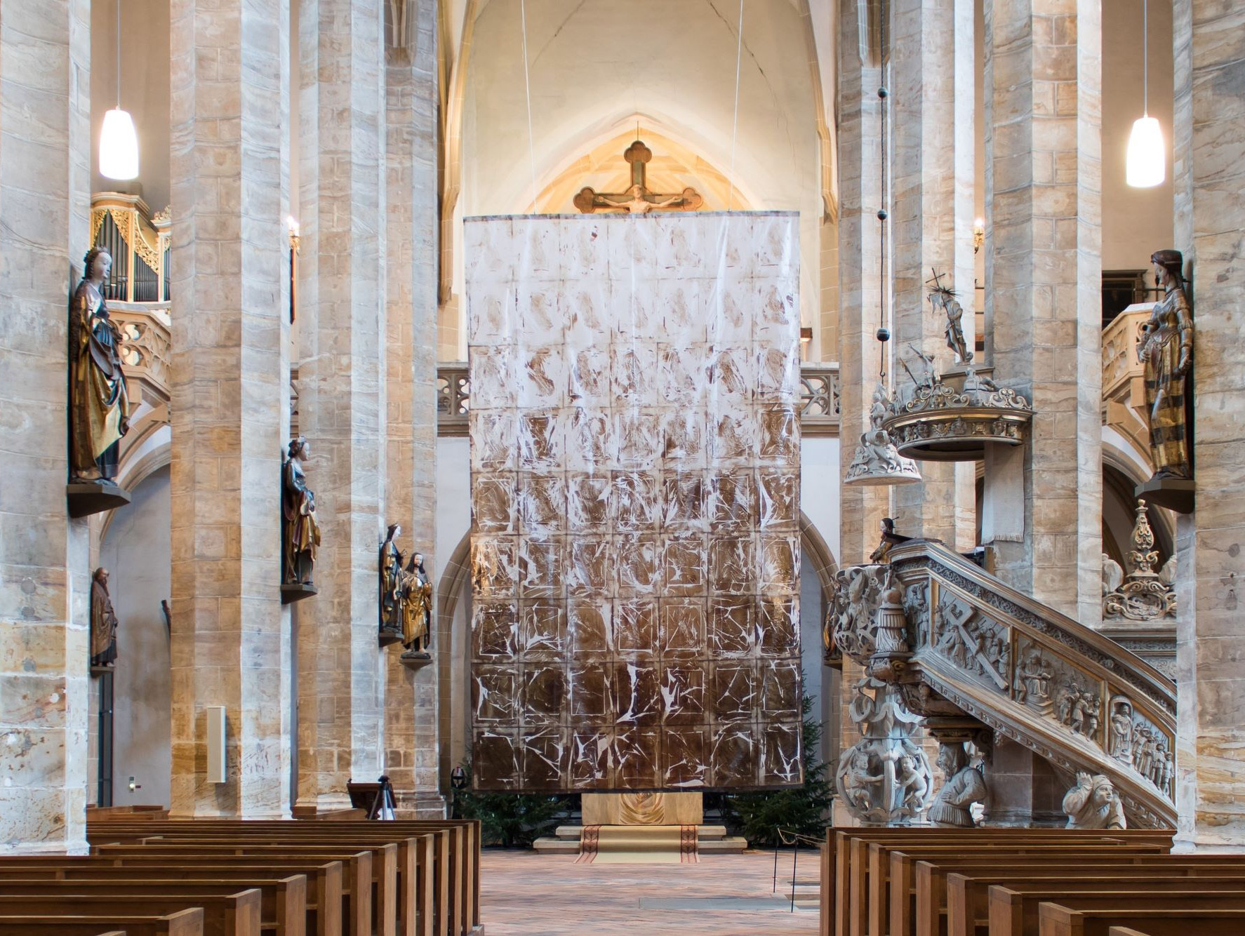 The Berlin artist Sabine Herrmann and the Chemnitz artist Michael Morgner will kick things off on 22 February 2023. Sabine Herrmann created the large-format work "Witnesses without text" for the apse of the Catholic Provost Church of St John Nepomuk on Chemnitz's Kaßberg. Michael Morgner's expansive work "Ecce Homo - Siehe, der Mensch!", created for this purpose, covers the 1560 altar retable in St Mary's Cathedral in Freiberg. The Passion series is curated by DAS KOLLEKTIV Herrmann Killisch Rheinfurth.