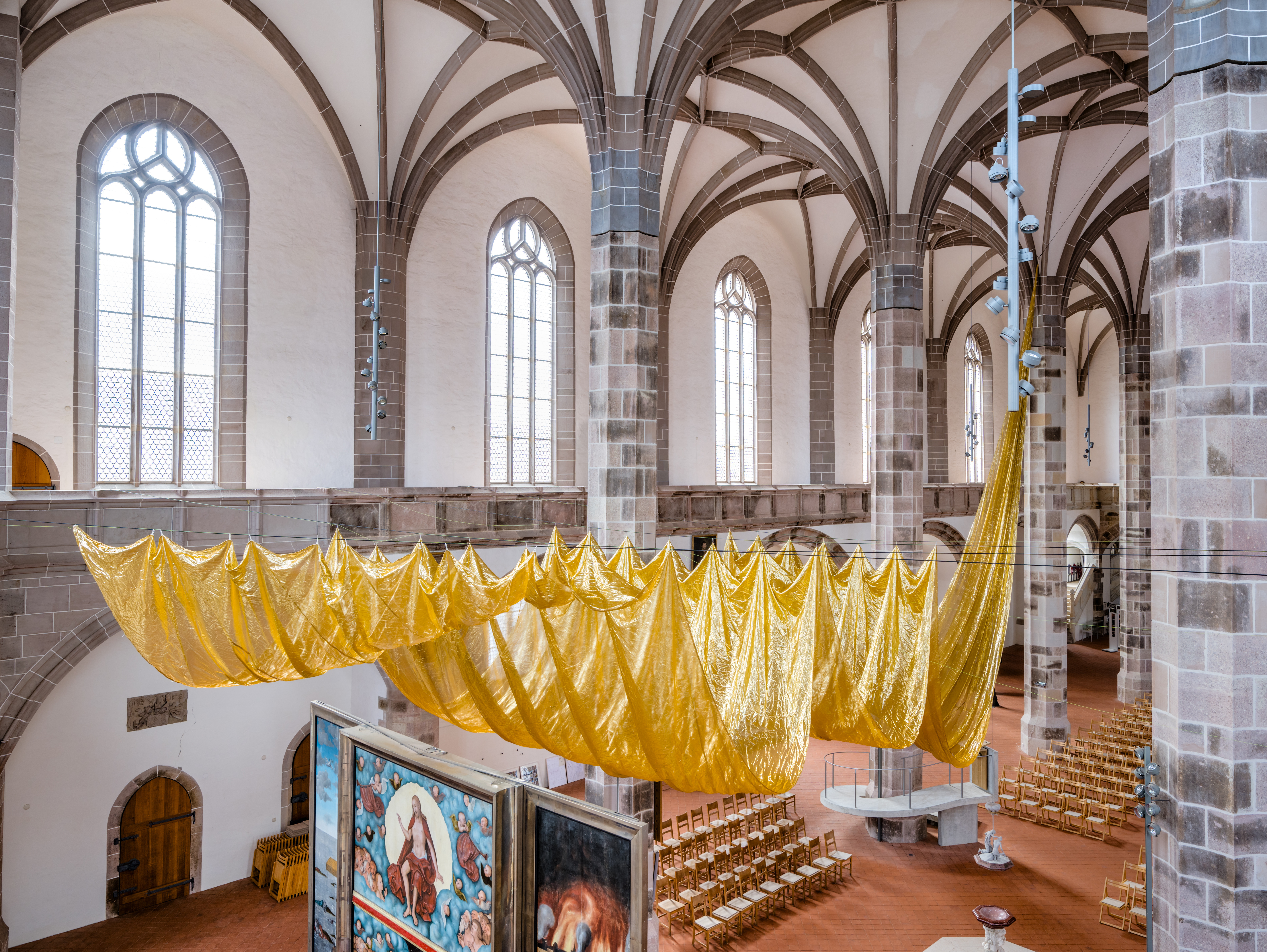 The veiling of the Cranach altar comes in the form of a golden cloud. The textile staging creates distance from the splendour of the altar. The cloud in the Bergmannsdom is a drapery in gold, the colour of immateriality. The drapery refers to the expressive formal language of vestments, particularly in Gothic painting, as we also find in Cranach's work.