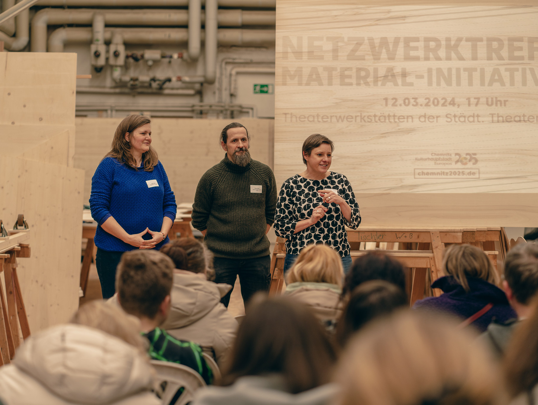 The Material Initiative for Chemnitz met for the fourth time in a special setting on Tuesday, 12 March: the workshops of the municipal theatres in Chemnitz opened their doors to the 30 participants of the network meeting. They included cultural associations and institutions, social organisations, companies, representatives of intervention areas of the Capital of Culture and interested private individuals. Workshop manager Norbert Richter provided valuable insights into the work and organisation of the theatre workshops, which put on around 30 productions per season.