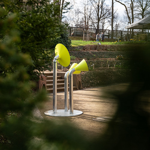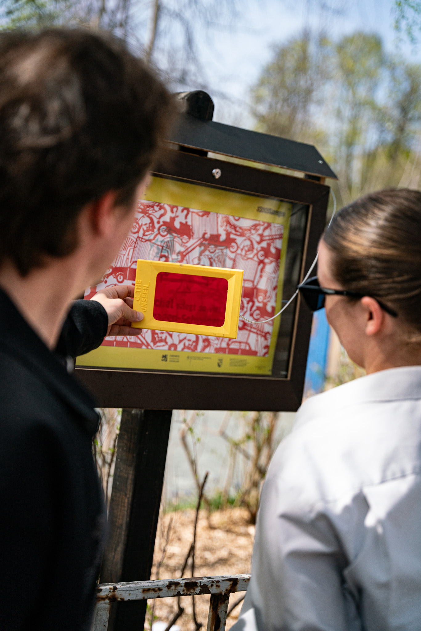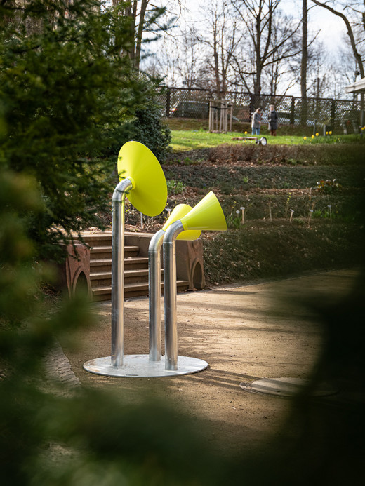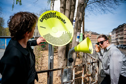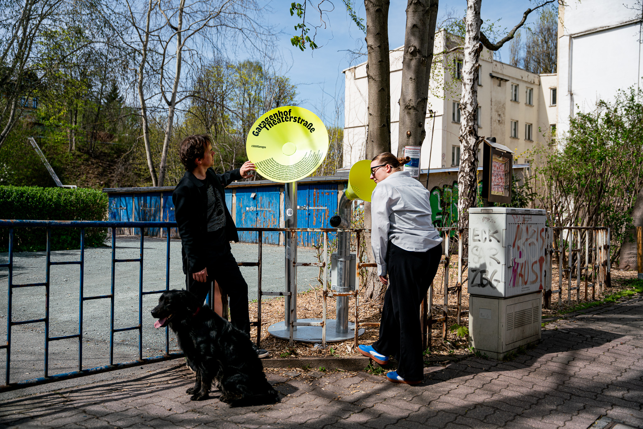 Residents and guests explored Chemnitz on their own with a walk along the garage trail. They strolled through the garage courtyard, looked over the fence, found local stories and got talking to their fellow residents. Bright yellow funnel-shaped information stations, designed by budding designers from Burg Giebichenstein University of Art and Design Halle, were set up at the 10 locations. These presented short stories and curious facts.