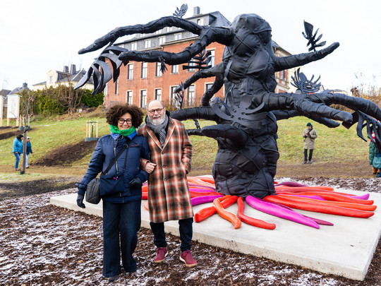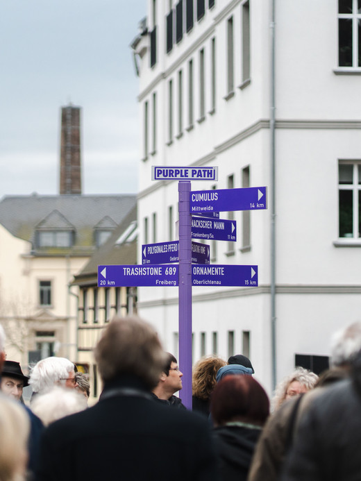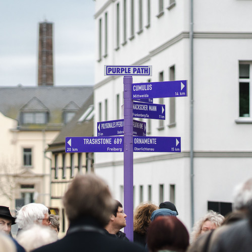The PURPLE PATH connects the citizens of Chemnitz with each other and with the people of 38 towns and municipalities in the region. A sustainably designed sculpture museum is being created in public spaces between Mittweida and Schwarzenberg, Glauchau and Seiffen, Freiberg and Schneeberg. Stars of the contemporary art scene such as Leiko Ikemura, Monika Sosnowska, Jeppe Hein or Michael Sailstorfer meet significant artists from Saxony such as Jana Gunstheimer, Via Lewandowsky and documenta artist Olaf Holzapfel. Chemnitz-based artists such as Johann Belz, Gregor-Torsten Kozik or Michael Morgner remain largely unknown in the West. Their works encounter international classics such as those by Rebecca Horn, who died in 2024, Daniel Buren and James Turrell.