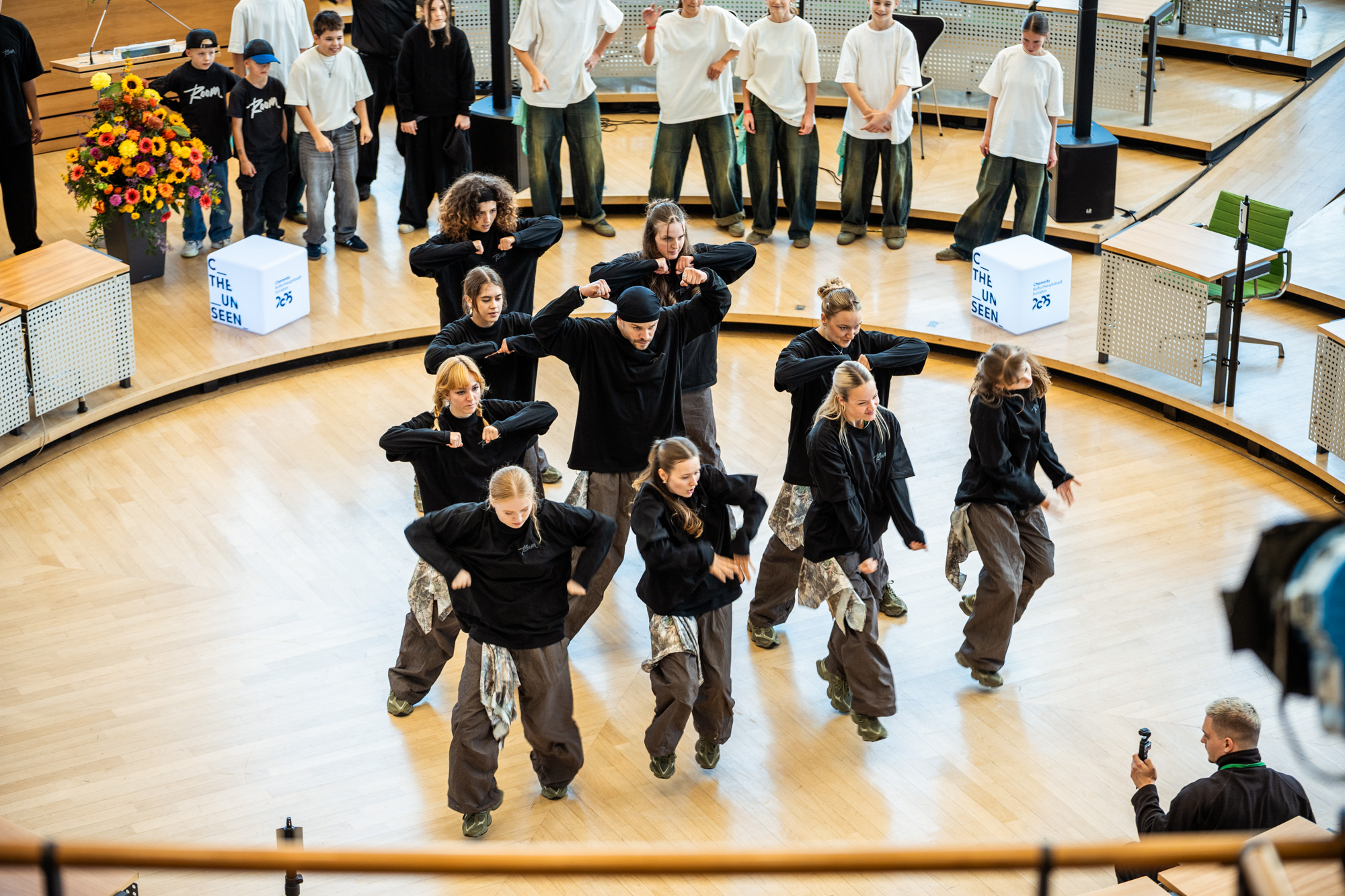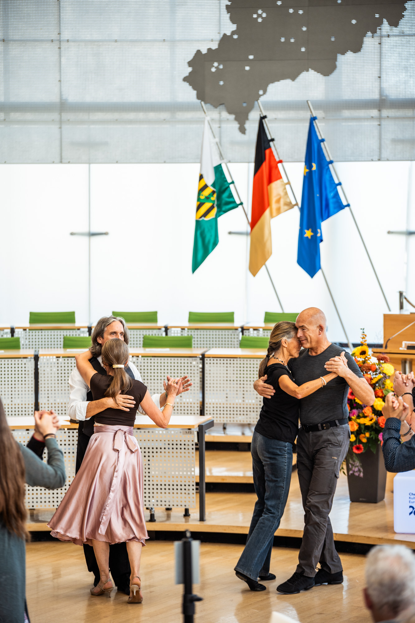 Beim diesjährigen Tag der offenen Tür im Sächsischen Landtag am 3. Oktober 2025 hat Chemnitz 2025 ein vielseitiges Kulturprogramm präsentiert: Im Plenarsaal, sonst Zentrum politischer Debatten, wurde für einen Tag ein Raum für Musik und Tanz geschaffen. Jürgen Karthe von der Sächsischen Mozartgesellschaft entführte die Besucher:innen mit seinem Bandoneon nach Argentinien. Karthe ist einer der wenigen, der das Instrument beherrscht. Die Tanzenden Nachbarn, das Chemnitz-2025-Tanzprojekt für Menschen über 60, und die Chemnitzer Tanzstudio Room Hip Hop Spot brachten unterschiedlichste Tanzstile und Choreografien in den Landtag und luden das Publikum zum Zuschauen, Staunen und Mitmachen ein.