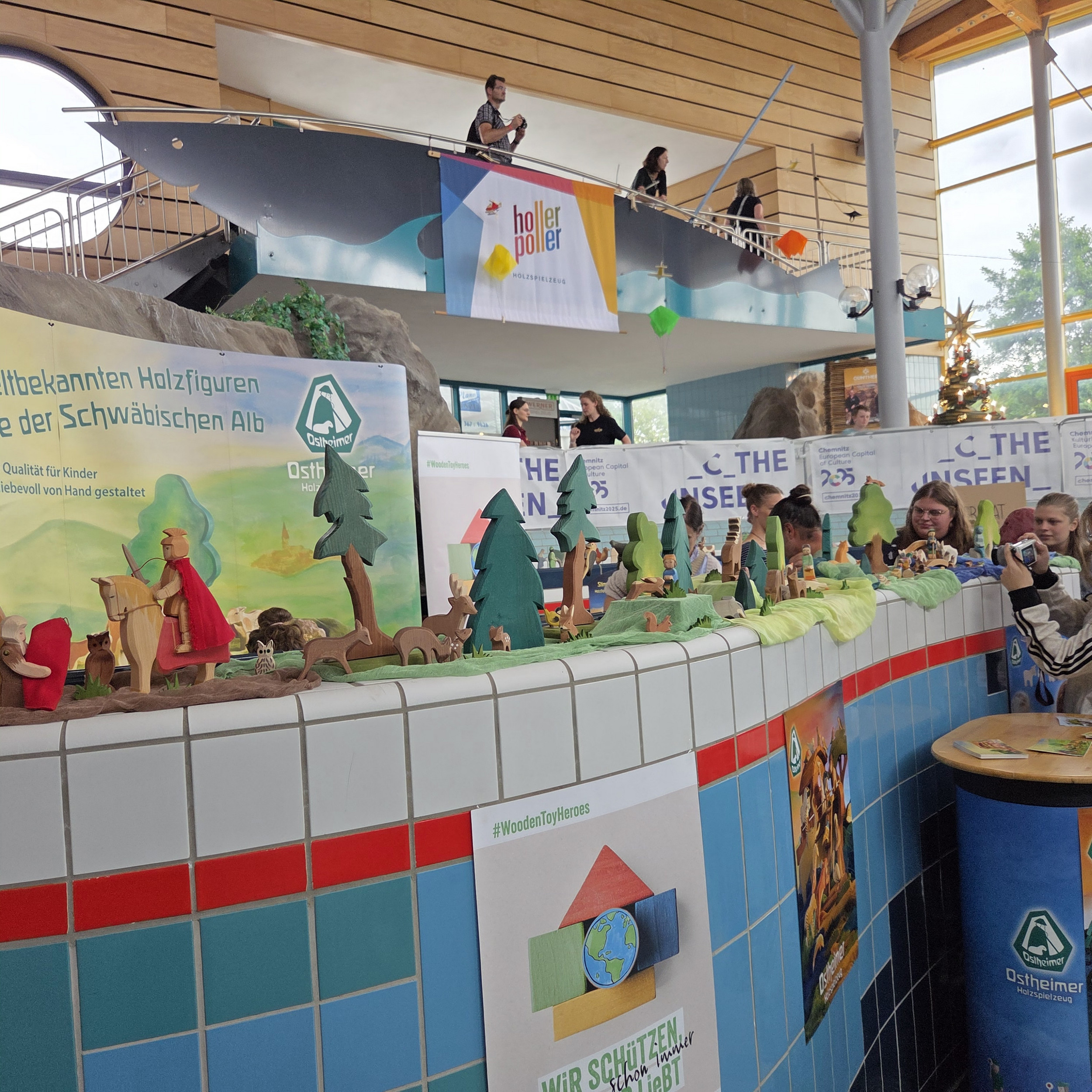 Organisiert wurde das Festival vom Projektteam Makers, Business und Arts gemeinsam mit der Denkwerkstatt Seiffen und Projektmanagerin Cheyenne Worotnik. Die Vielfältigkeit – von den Ausstellungen der Produkte der Spielzeugmacher über Workshops bis hin zu den Konzerten – fanden wir so interessant, dass wir uns zum Kernteam gemeldet haben. Los ging’s donnerstags mit dem Aufbau – z.B. Mannheimer verkleiden, Biertischgarnituren und Infostand aufbauen usw. Am nächsten Tag kamen die Austeller und das ehemalige Bad wurde nicht nur mit Leben gefüllt, sondern auch mit wunderschönem Spielzeug aus verschiedenen Ländern. Der Freitag war auch der Tag der Workshops – die Teilnehmer saßen dafür zum Teil im ehemaligen Schwimmbecken. Mit der Beschriftung „Ab hier Barfußbereich“ fanden sie (natürlich mit Schuhen) zum Veranstaltungsort.