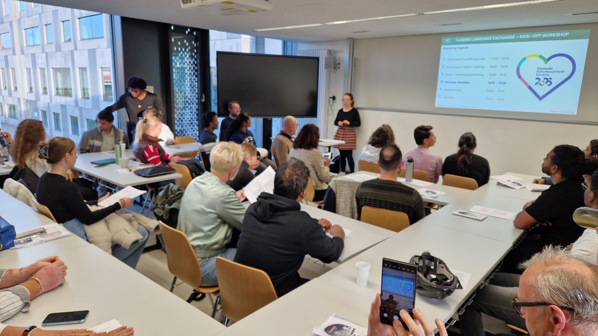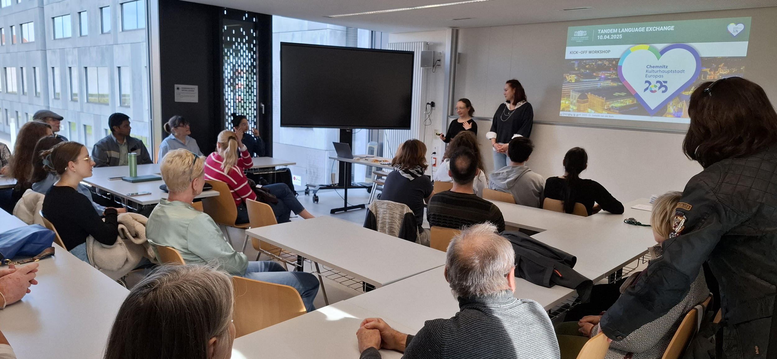 Am 10. April 2025 fand am Zentrum für Fremdsprachen (ZFS) der Technischen Universität Chemnitz der offizielle Kick Off Workshop für das Kulturhauptstadt-Tandem-Programm statt. Die Veranstaltung wurde unterstützt von Dr. Maria Worf, Geschäftsführerin des Zentrums für Fremdsprachen, initiiert und koordiniert vom English Department, vertreten durch Dr. Isabelle van der Bom und Dr. Patrick McCafferty, sowie dem Freiwilligenprogramm der Kulturhauptstadt Chemnitz, repräsentiert durch Delfina Zdebel (Assistentin der Freiwilligenprogramm) und Anton Schneider (Koordination der Freiwilligenprogramm). Ziel der Veranstaltung war es, internationale und lokale Studierende sowie Chemnitzer:innen, die als freiwillige Helfer:innen Besucher:innen der Kulturhauptstadt Europas 2025 auf Veranstaltungen begleiten auf innovative Weise sprachlich und kulturell miteinander zu vernetzen.