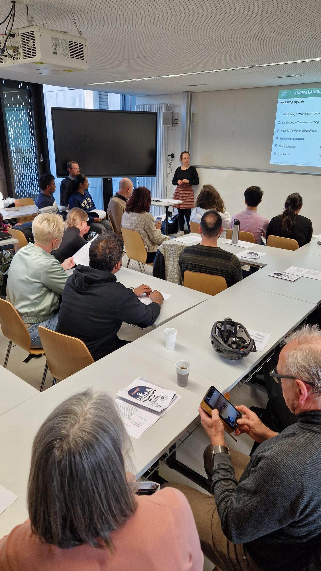 Zum Auftakt des Workshops erhielten die Teilnehmenden eine Einführung in die Idee des Tandem-Lernens. In einer interaktiven Präsentation wurde aufgezeigt, wie sprachliches Lernen durch gegenseitiges Unterstützen in interkulturellen Lernpartnerschaften gefördert werden kann – mit besonderem Bezug auf die sprachlichen und kulturellen Anforderungen, die sich im Kontext von Chemnitz als Kulturhauptstadt stellen. Dabei ging es nicht nur um den Erwerb sprachlicher Kompetenzen, sondern auch um den bewussten Umgang mit kultureller Vielfalt und gemeinsamen Interessen.