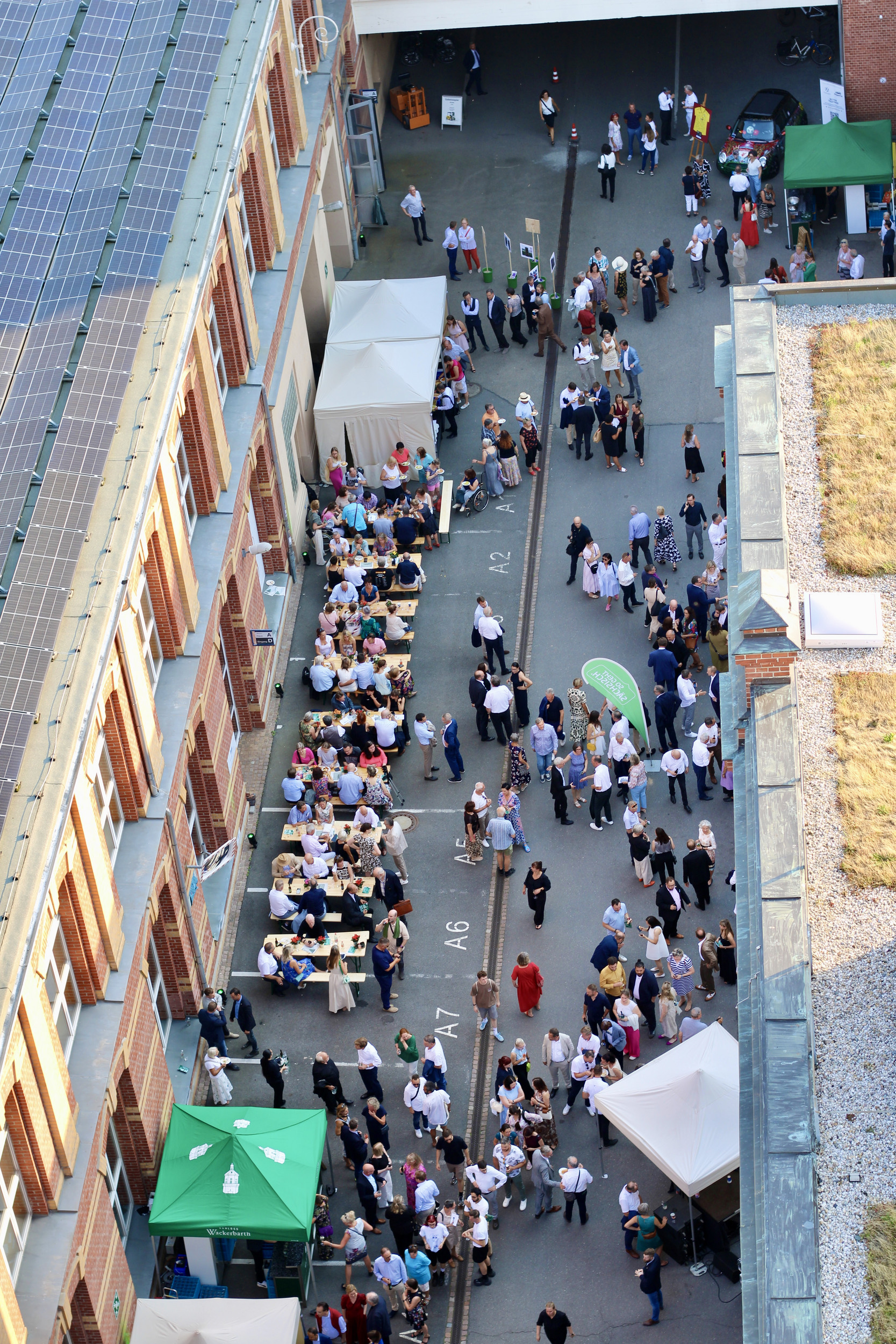 Nach dem offiziellen Teil verlagerte sich die Veranstaltung nach draußen vor die Halle, wo uns kühle Getränke und ein vielfältiges Speisenangebot erwarteten. Die Sitzplätze füllten sich schnell, ebenso die tolle Dachterrasse, perfekt für einen heißen Sommertag. Zum weiteren Programm gehörten eine Versteigerung von Geschenken aus der Asservatenkammer der Sächsischen Staatskanzlei und die Möglichkeit, den 63 m hohen Turm des Wirkbaus zu besteigen.