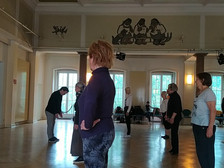 Die Gruppe hatte Aufstellung genommen. Aus der Konserve kam die passende Musik. Die TeilnehmerInnen setzten die Anleitungen des Übungsleiters aufmerksam um. Nicht lange und es fielen die ersten Fachbegriffe wie Position 1, Position 2 usw. Das klang ja dann doch eher nach Ballett. Die Irritation hielt nicht lange an. Scherzhaft hatte Michal Sandor ja auch mehrfach gesagt, dass es hier nicht um Spagat gehe. Der weitere Verlauf der geplanten zwei Stunden brachte wie versprochen gemeinsame Bewegung – nicht mehr und nicht weniger.