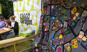 Am Stand „Vogelperspektiven“ lud die „Wollbine“ Frau Sabine Hochmuth zum Mitmachen ein. Seit 2024 entsteht in verschiedenen Workshops und bei anderen Gelegenheiten - wie eben auch beim Festival auf dem Harthweg - ein großer Wandteppich. Viele Silhouetten bekannter Gebäude der Stadt Chemnitz wurden bereits aus Filz gefertigt. Auf einer textilen „Stadtkarte“ werden diese von Frau Hochmuth platziert. (Siehe beigefügtes Foto) Ab dem 18. Oktober 2025 wird der Teppich im Garagencampus zu bewundern sein.