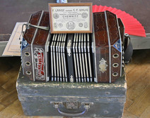 Geschickt  wurden die wertvollen Instrumente und Verpackungskartons unter ihrer Regie auf Samttücher drapiert. Die Vorstellung, ich trage ein AA (Alfred Arnold) -Bandoneon, dass eine ungeheure Weltreise hinter sich hat, machte mir Gänsehaut.
