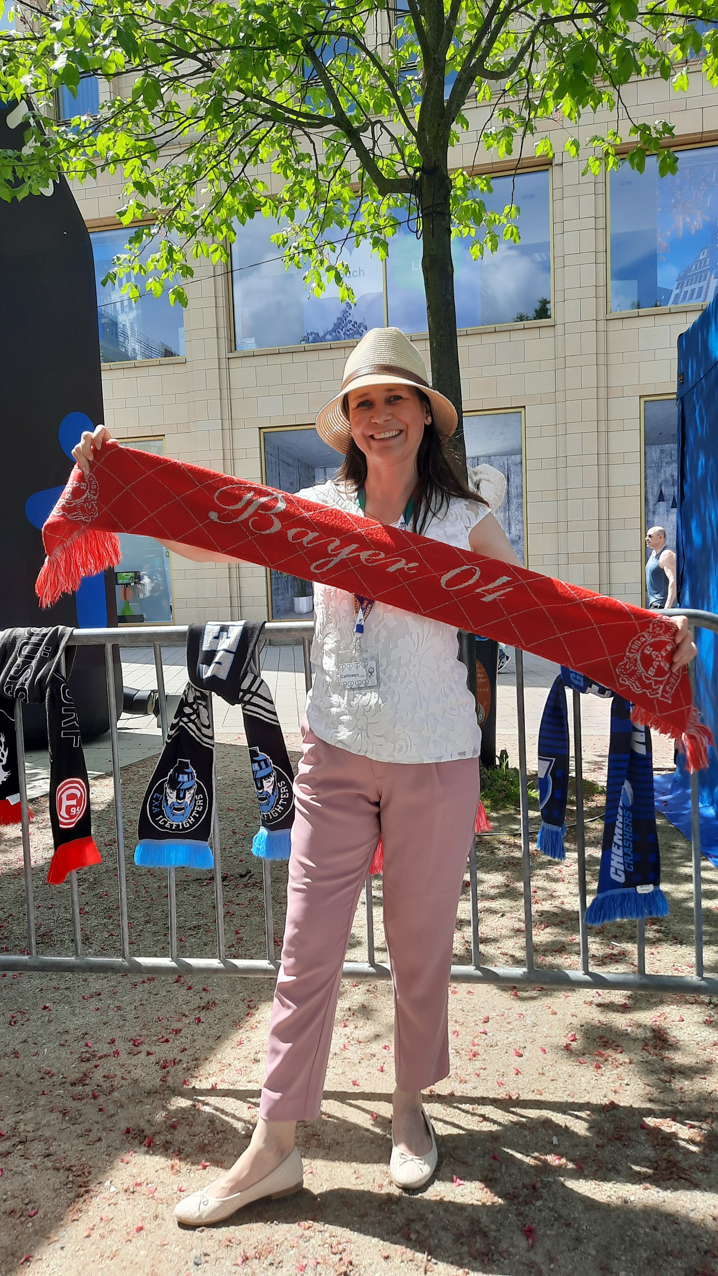 31.05.2025, es ist 10.15 Uhr, ich mache mich fertig und laufe los, um pünktlich 11 Uhr am Roten Turm zu sein, denn dort steht das Zelt von Sports United. Hier wird für das Projekt „Fanschal“ geworben. Für dieses Projekt werden ganz viele Fanschals gebraucht, welche dann zusammengenäht werden und am 06.09.2025 im Rahmen von Sports United als Überraschung (längster Fanschal) dekorativ drapiert werden.