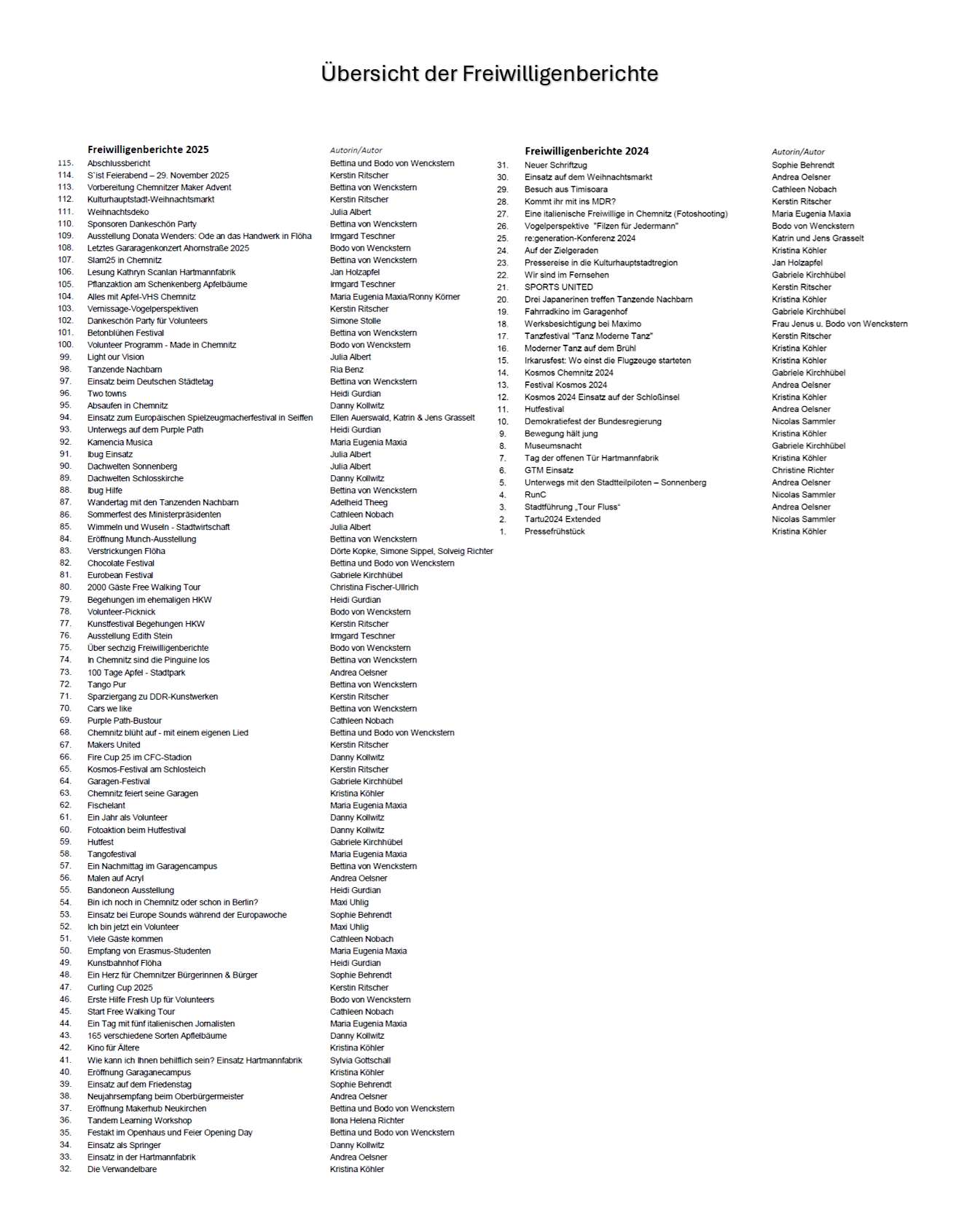 Die zahlreichen Highlights aus den Jahren 2024 und 2025 sind in den Freiwilligenberichten im Internet nachzulesen. So entstand eine Chronik voller erlebnisreicher Momente. Natürlich können wir die über 45.000 geleisteten Volunteer-Stunden nicht vollständig beschreiben, doch die Texte der 31 Volunteers geben einen lebendigen Überblick über das stattgefundene abwechslungsreiche Angebot der Kulturhauptstadt 2025 in Chemnitz. Die Vielfalt der Veranstaltungen, Erlebnisse und ganz persönlicher Eindrücke spiegelt sich in den Artikeln wider.