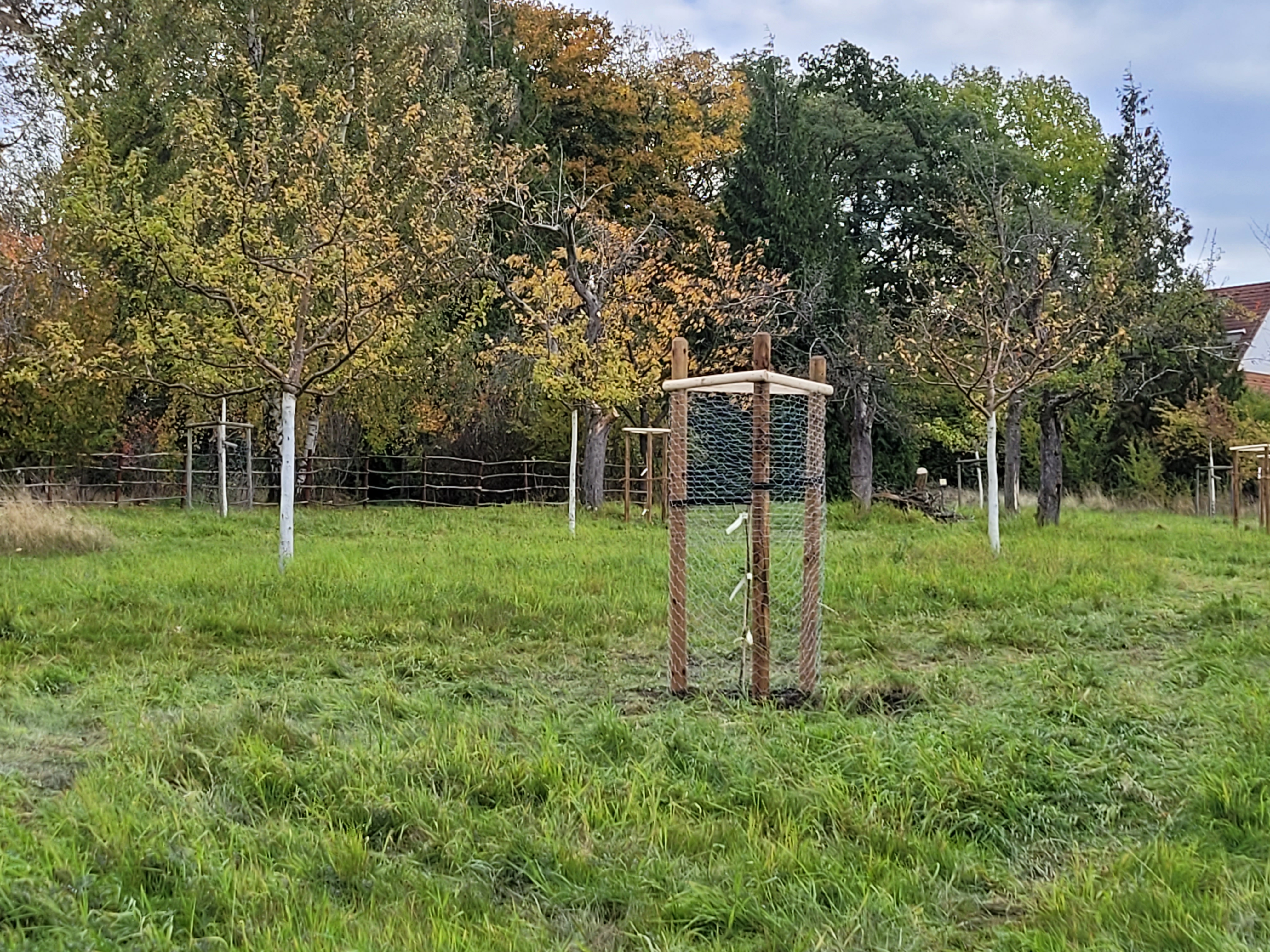 Den Abschluss der Pflanzaktion bildete das Setzen des Dreibocks zur Stabilisierung der jungen Bäume und das Anbringen des Netzes gegen Rehbiss durch die Fachleute des NABU, die auch das Wachsen und Gedeihen der jungen Apfelbäume im nächsten Jahr im Blick behalten. Mitpflanzen war ausdrücklich erwünscht. Diesem Aufruf folgte auch eine junge Familie, die sich die Chance nicht entgehen ließ, selbst Hand anzulegen und dabei etwas zu lernen.