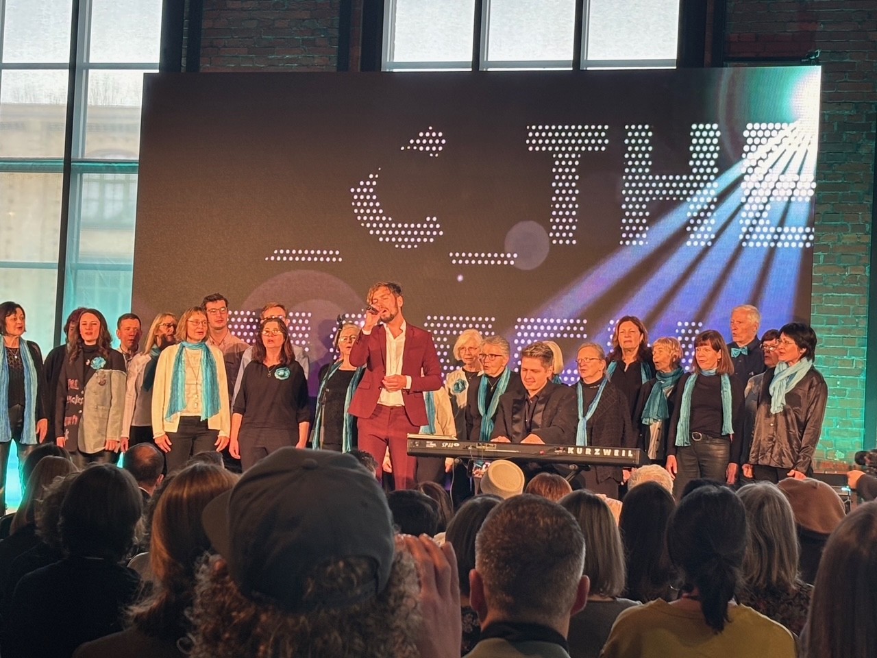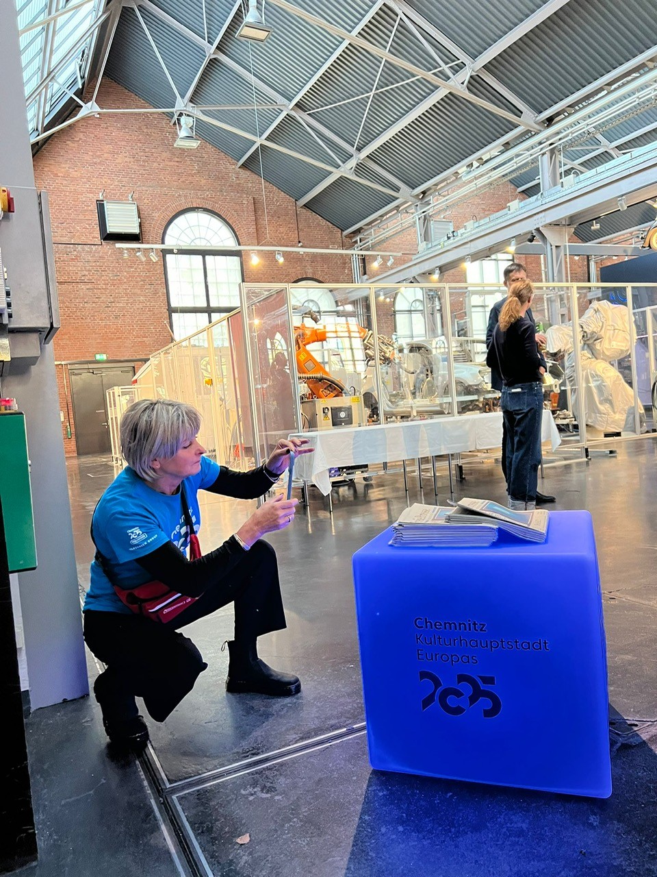 Mein erster Einsatz an diesem Tag war im Industriemuseum, denn dort fand die offizielle Abschlussveranstaltung der Europäischen Kulturhauptstadt 2025 mit den geladenen Gästen statt. Meine Aufgabe war es, an der Eingangstür zu stehen und die Gäste freundlich zu begrüßen und willkommen zu heißen. Als alle Gäste ihre Plätze eingenommen hatten, haben wir Volunteers ebenfalls im Veranstaltungsraum Platz genommen. Es war eine schöne, festliche und sehr bewegende Veranstaltung. Der Bürgermeister von Chemnitz, Herr Sven Schulze, ließ das KuHa – Jahr noch einmal Revue passieren, indem er, zusammen mit einem kleinen Mädchen, KuHa-typische Dinge aus einem gelben Koffer nahm und kleine Geschichten dazu erzählte. Am meisten hat mich bewegt, als unserer ehemaligen Bürgermeisterin, Frau Barbara Ludwig, gedankt wurde. Ihr und ihrem Team haben wir zu verdanken, dass Chemnitz den Titel „Kulturhauptstadt“ bekommen hat, denn sie hat die Bewerbung damals zum Erfolg gebracht. Alle Gäste standen von ihren Plätzen auf und der Beifall für Frau Ludwig wollte nicht enden. Das hat sie wirklich verdient! Zum Schluss traten der Sänger Felix Räuber und der Chor aus Chemnitzer Bürgern mit der „Hymne für Chemnitz“ auf.