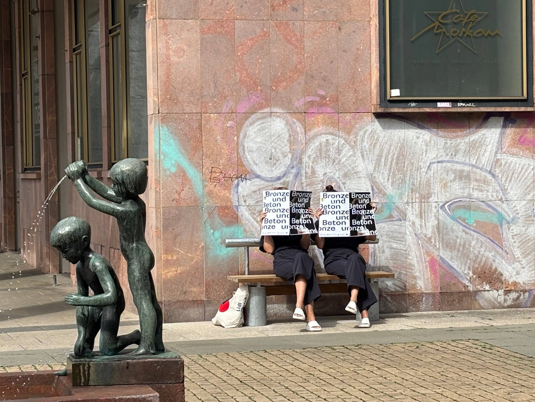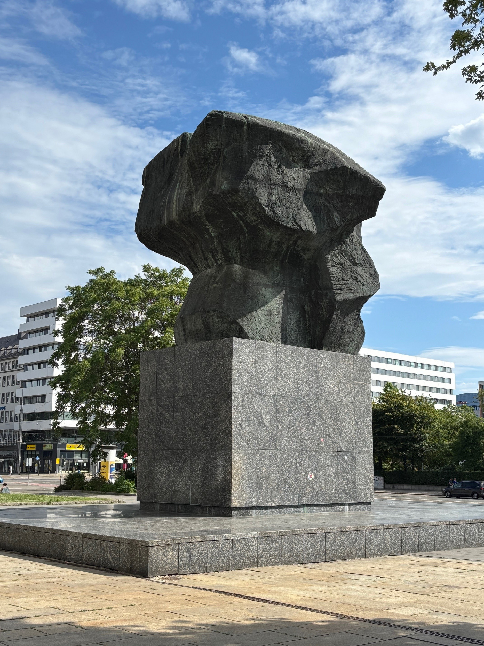 Unsere drei Stadtführer, gekleidet in schwarzem, an alte DDR-Schnittmuster angelehntem Einheitslook, stellten sich kurz vor und begrüßten alle Teilnehmer mit Handschlag. Die drei kommen ursprünglich aus Berlin und sind bis Oktober 2025 über ein von der Kulturhauptstadt unterstütztes Programm in Chemnitz. Sie hatten eine Lautsprecherbox dabei, aus der lautstark DDR-Musik ertönte. Mein Gott, wie lange habe ich diese Klänge nicht mehr gehört, aber gleich wiedererkannt! Unsere Gruppe schlenderte nun durch die Chemnitzer Innenstadt, über den Brühl zum Schlossteich und machte an verschiedenen Bronze- und Betonskulpturen und Bauwerken halt. Aus der Box kamen Stimmen. Genauer gesagt wurden Briefe vorgelesen, die Werktätige, Parteigenossen, Funktionäre in den Jahren von 1960 bis 1989 an ihre Freunde oder Familienangehörige geschrieben hatten. Zum Beispiel hörten wir, als wir am Karl-Marx-Kopf standen und zur Stadthalle und dem Hotel „Kongress“ hinüberschauten, einen Beitrag aus dem Jahr 1973. Eine junge Frau, Lehrling des Volkseigenen Betriebes „VEB Strickmaschinenbau Karl-Marx-Stadt“, schrieb an ihre Schwester, die sie “hoffentlich bald in Karl-Marx-Stadt besuchen kommen soll”, wie schön die Stadt ist. Sie schrieb, dass entlang der Straße der Nationen viele Neubauten mit Wohnungen und Geschäften errichtet wurden und dass es neue, breite sechsspurige Straßen gibt, die so gebaut wurden, dass in Zukunft viele Autos drauf fahren können. Sie schrieb auch, dass Walter Ulbricht, der Staatsratsvorsitzende der DDR, in der Stadt war und den neuen Gebäudekomplex an der Karl-Marx-Allee bei einer Kundgebung und anschließender Feier selbst eingeweiht hat. Sie war sehr stolz dabei gewesen zu sein. Die Verfasserin war generell sehr stolz in Karl-Marx-Stadt zu arbeiten, zu wohnen und am Wiederaufbau ihrer Stadt mitwirken zu dürfen. Ich konnte mich durch diese Texte schon gut in die Welt von damals reindenken und fühlen, was den Menschen wichtig erschien.