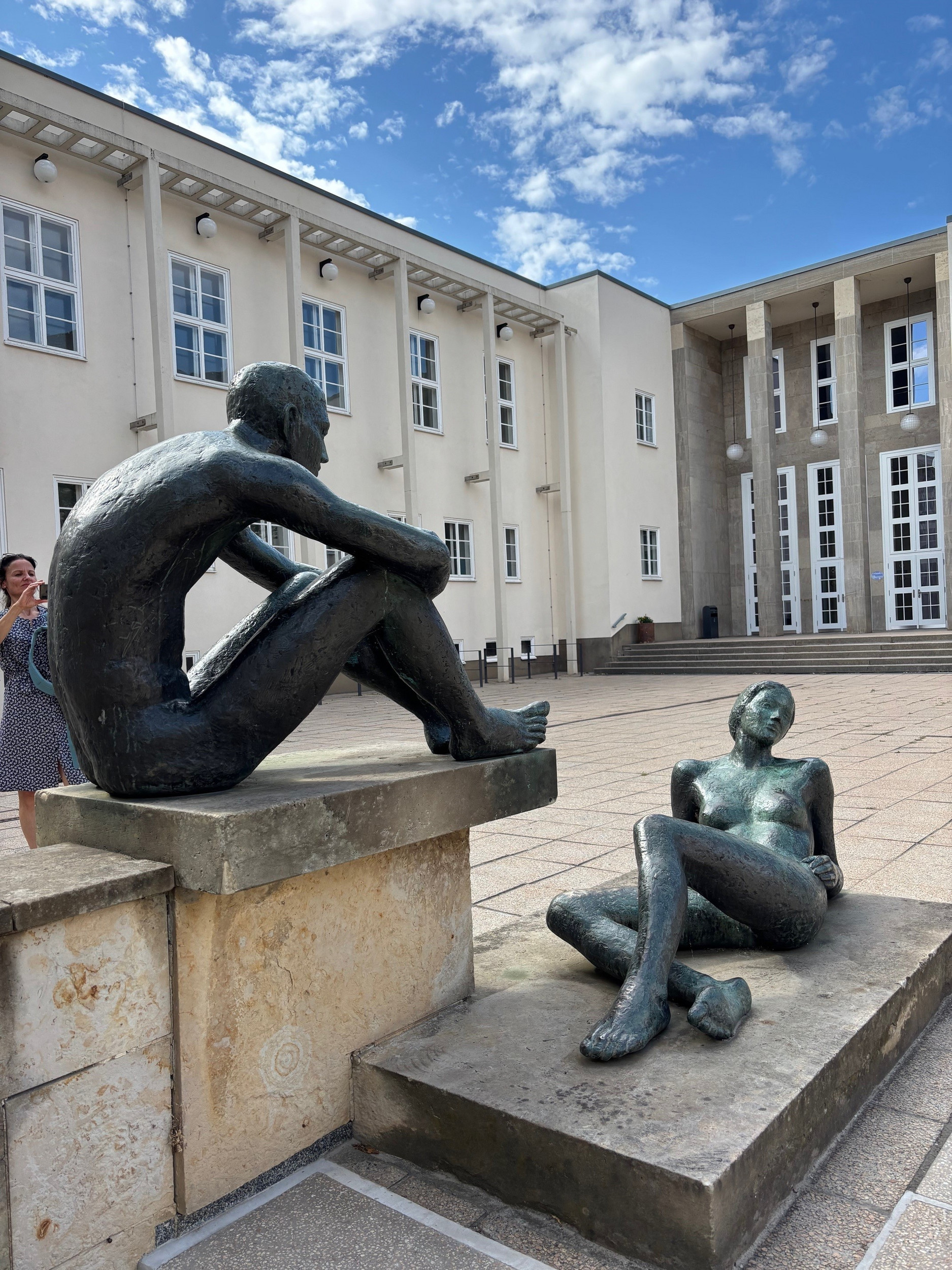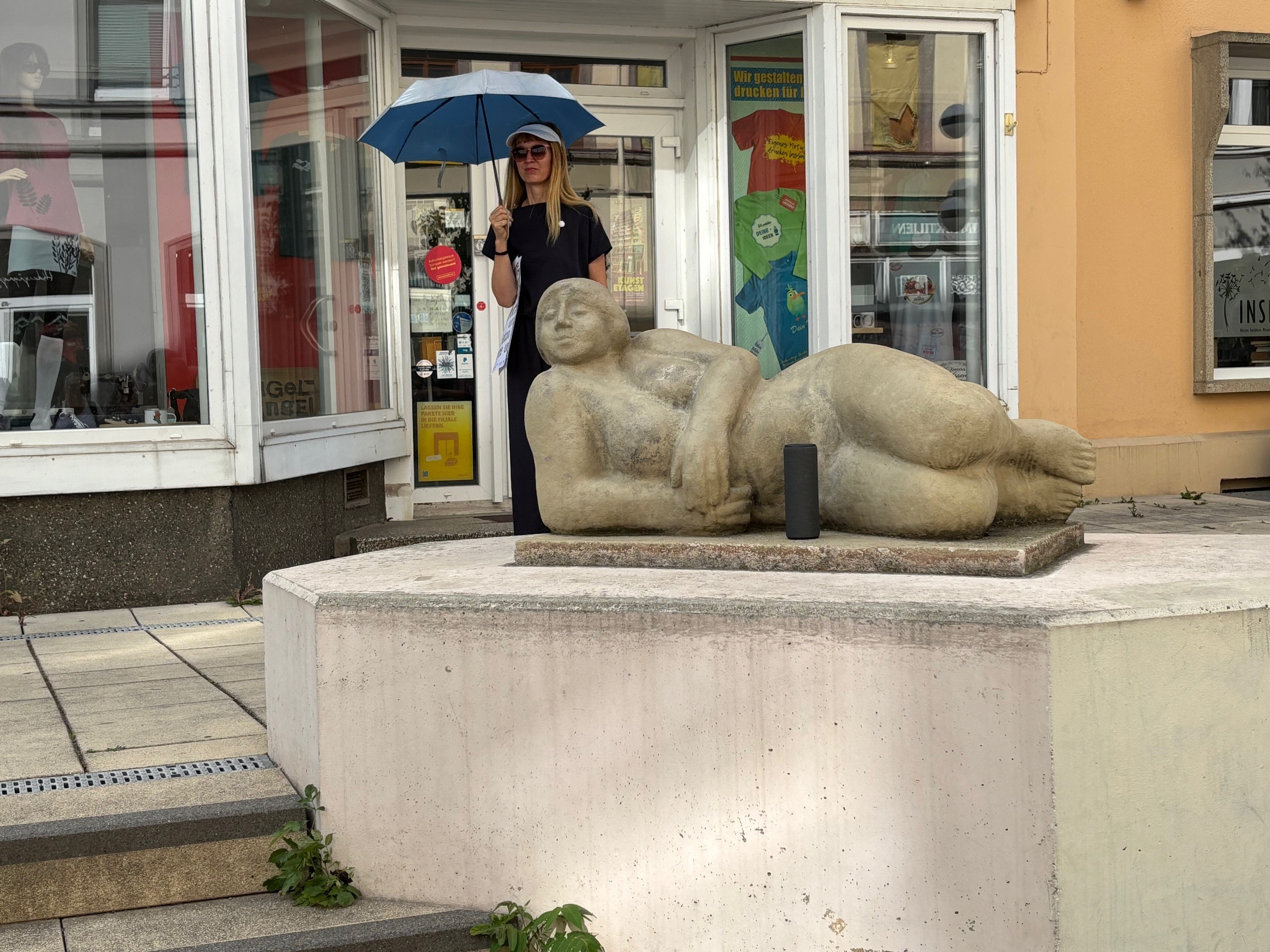 Heute berichte ich von keinem Volunteer-Einsatz, sondern als ganz normale Chemnitzerin. Ich hatte im Kulturhauptstadt- und dem Newsletter der „Freien Presse“ unter der Überschrift „Fetzt.- Die Kuha zieht nach draußen“ die Ankündigung von einem Spaziergang durch die Chemnitzer Innenstadt gelesen und das hat mich neugierig gemacht. „Das Institut für Ostmoderne lädt zu einem interaktiven künstlerischen Spaziergang durch die Chemnitzer Innenstadt ein." Mit einer Performance, Hörbeiträgen, einem Workshop zum Modellieren eigener Skulpturen und einer spielerischen Skulpturenrallye mit Quiz werden einige der Kunstwerke kennengelernt, die zwischen 1960 und 1989 entstanden sind. Treffpunkt war am kleinen Springbrunnen in der Straße der Nationen. Wir waren ca. 50 Menschen - Chemnitzer, Berliner, Österreicher, Saarländer, Leipziger und …. also ein bunt zusammengewürfeltes Teilnehmerfeld.