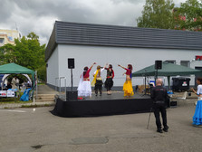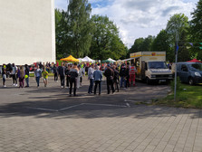 Wir Volunteers beteiligten uns gut gelaunt und zusammen mit Malu Kunze von der gGmbH mit einem Pavillon, 1 Tisch und zwei Bänken am Geschehen. Kindern boten wir die Möglichkeit, Armbänder aus kleinen Perlen zu basteln. Dieses Angebot kam sehr gut an. Der Tisch war von Beginn an stark umlagert. Den auf der Tischplatte angeklebten Prospekten und Flyern konnte der Wind zwar nichts anhaben, aber zu sehen waren diese trotzdem nicht. Der ganze Tisch war voll von Bastelmaterial. Hella und zwei junge ukrainische Volunteers widmeten sich mit Eifer den Kindern und ihren Halsketten. Stolz zeigten die Kleinen ihren Eltern oder Großeltern die Bastelergebnisse. Neugierig steuerten sie auf den nächsten Stand zu. Im Basteln absolut talentfrei schnappte ich mir ein paar Flyer und versuchte, den einen oder anderen Besucher – wie ich immer sage – „in ein Gespräch zu verwickeln“. Das Interesse der Besucher hielt sich in Grenzen. Man stellte kaum Fragen. Eine Gruppe Jugendlicher hörte mir höflich zu, nahm ein paar Flyer, ohne kaum etwas zu sagen. Das vieldeutige Lächeln der jungen Besucher ließ mich nur vermuten, was in ihren Köpfen vorging. „Ich hätte dranbleiben müssen“, sagte ich mir. „Wo liegt die Grenze zwischen guter Kommunikation und nervigem Gelaber?“, war mein zweiter Gedanke. Ich zog weiter durchs Gelände. Interesse am Freiwilligenprogramm war hier und da zu spüren. Eine Gesprächspartnerin ließ mich mit einem „vielleicht“ zurück. „Ich werde es mir überlegen.“ So ihr Fazit am Ende unseres Gesprächs. Ich hoffe sehr, dass ich ihr bei einem der nächsten Einsätze als Volunteer begegnen werde. Die passende Ausstrahlung hat sie auf jeden Fall. Sehr sympathisch.