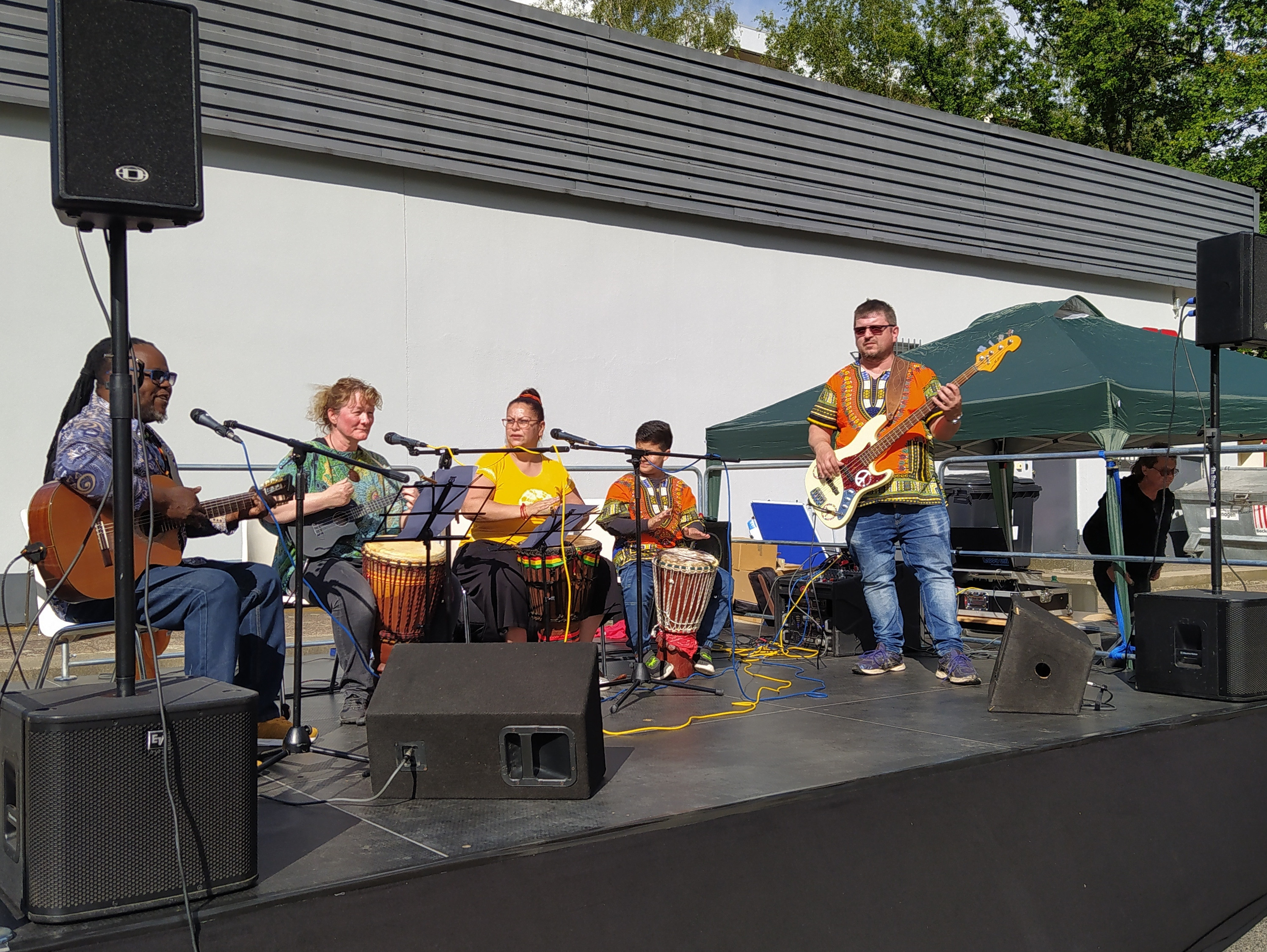 Das liebevoll vom Veranstalter zusammengestellte Programm konnten wir von unserem Stand aus nur bruchstückhaft wahrnehmen. Bei meinem Rundgang über das Gelände verweilte ich hin und wieder vor der Bühne. Das vorwiegend musikalische, durchaus anspruchsvolle Programm zog die Menschen an. Man stand entweder unmittelbar vor der Bühne oder schaute, während man sich Kaffee, Kuchen, Bier oder Rauchwurst und Steaks schmecken ließ, zu.