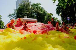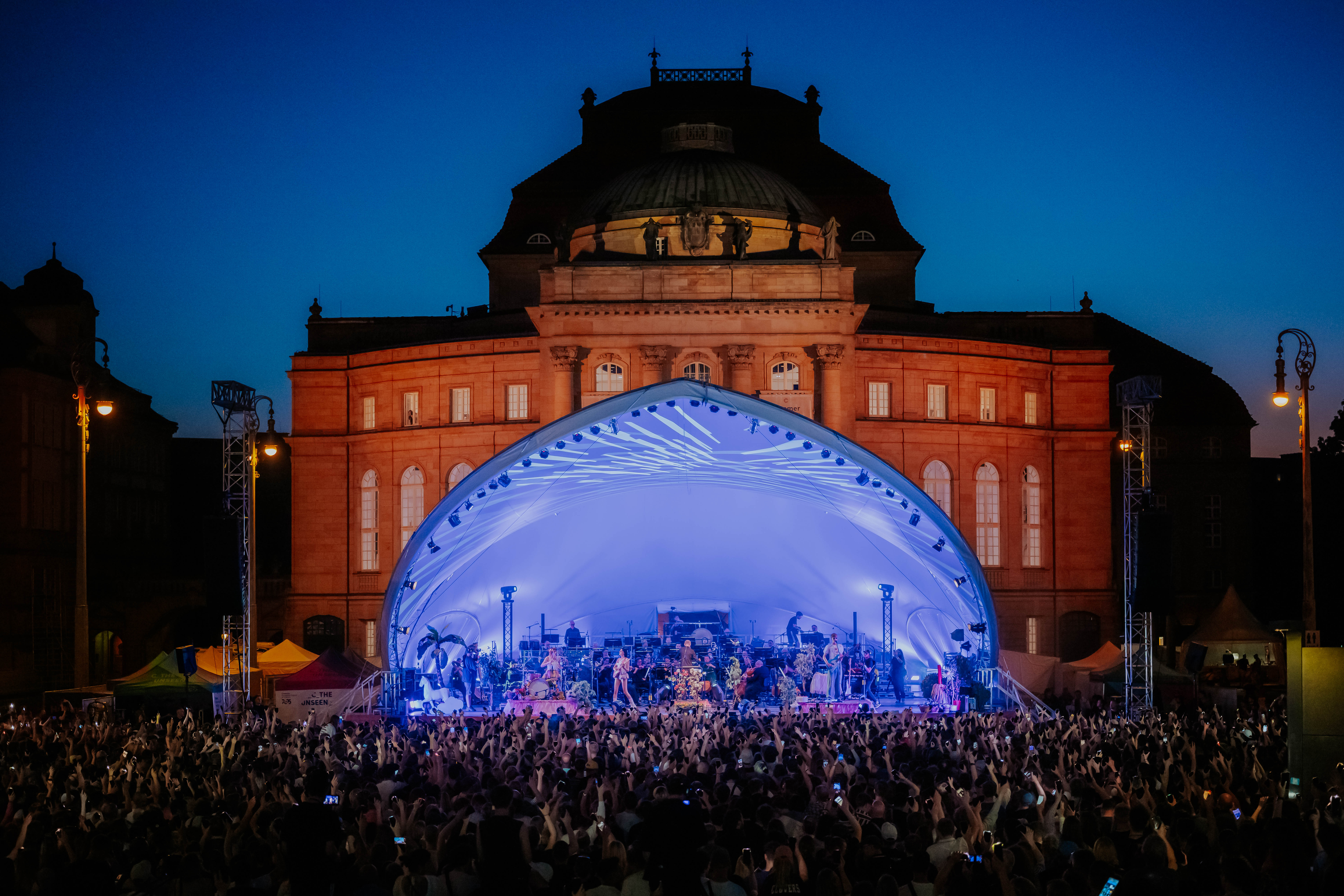 Viele Gäste waren angereist, um gemeinsam mit den Menschen aus Chemnitz zu feiern. Am Freitagabend läutete die Chemnitzer Band Blond zusammen mit der Robert-Schumann-Philharmonie auf dem Theaterplatz das Festivalwochenende ein. Eine Bandbreite an musikalischen Acts lieferte den Sound fürs Wochenende: Es spielten Künstler:innen wie Juli, Nura oder Deine Freunde, es gab Bühnen für u.a. Club-Musik, Indie-Pop, Hip Hop, Techno, Punk, experimentelle Musik, Jazz oder Salsa.