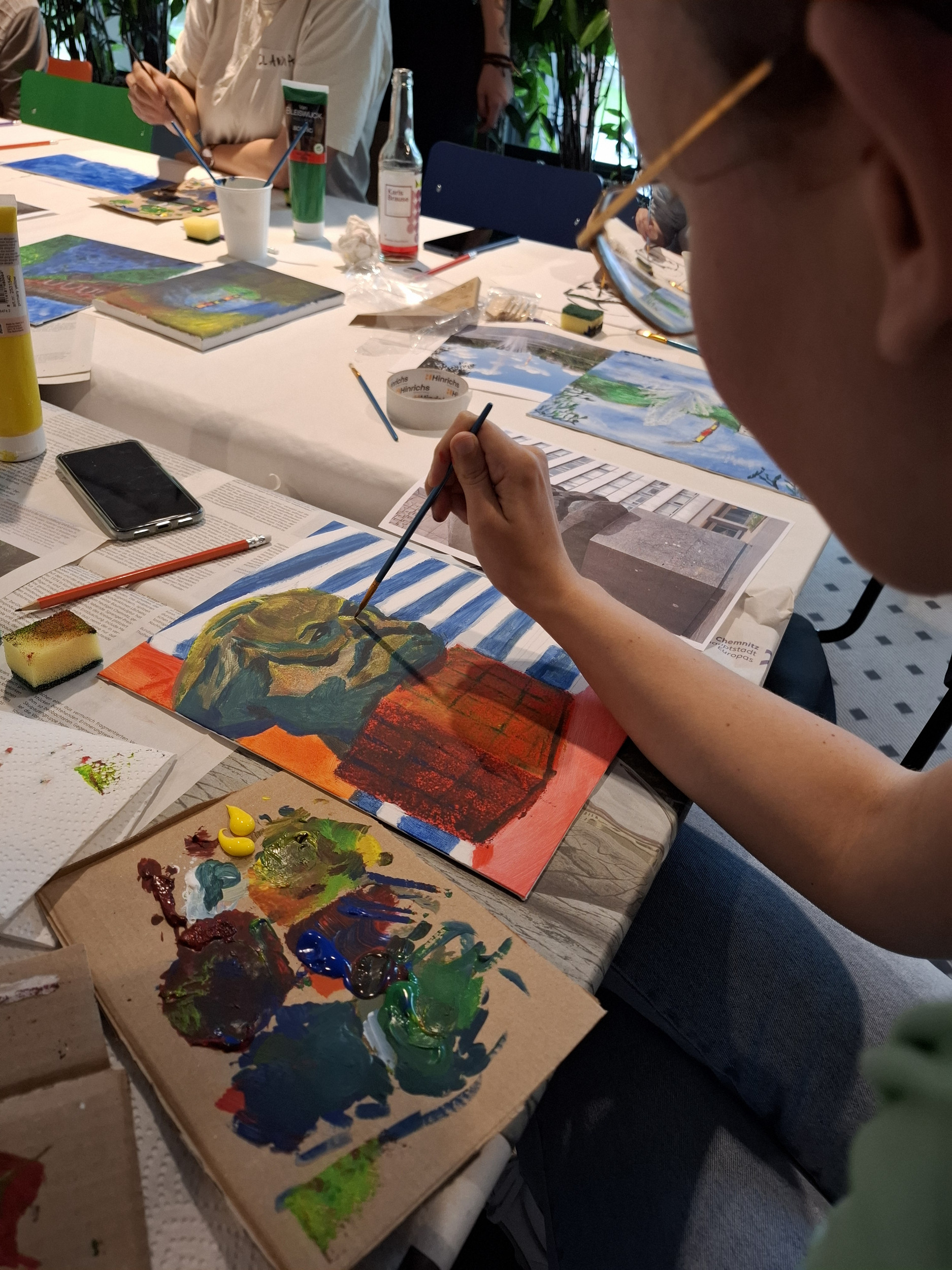 Ich finde es generell eine gute Idee, die Möglichkeiten zu nutzen, die sich in unserer Volunteer-Gemeinschaft bieten. Als das Angebot kam, zusammen mit anderen Ehrenamtlichen unter fachkundiger Anleitung mit Acryl zu malen, habe ich mich sofort angemeldet. Das wollte ich schon immer ausprobieren. Am 27. Mai war es dann so weit. Ich machte mich voller Vorfreude auf den Weg in die Schmidtbank, wo die Veranstaltung stattfand. Noch größer war meine Freude, als ich sah, wer uns Anleitung und Hilfe geben wollte: Norma, eine engagierte Freiwillige, die ich vom Free Walking kenne, und Martin, auch ein Volunteer, den ich sehr schätze. Beide hatten den Raum schon vorbereitet, auf den Tischen standen die Pinsel bereit, das Wasser war in den Bechern und die Farben? Es gab genau 5 Flaschen in den Grundfarben Rot, Weiß, Schwarz, Blau und Gelb. Das sollte für uns alle reichen? Und warum nur fünf? Es gibt doch auch noch Grün, Braun, von den Zwischentönen ganz zu schweigen. Wie sollte das denn funktionieren? Ich sah mich schon als Vertreterin einer eigenen Kunstrichtung: knallige Farben mit wenig Bezug zur Realität. Aber gab es das nicht schon mal? Meine Gedanken wurden von Normas einführenden Worten unterbrochen, danach stellten sich die Teilnehmerinnen vor. Ja, ihr lest richtig, Teilnehmerinnen. Außer Martin war kein weiterer Mann im Raum. Wahrscheinlich waren die bei den Garagen. ;- Und dann durften wir loslegen mit Motiven zum Thema Chemnitz. Einige hatten sich vorbereitet und etwas mitgebracht, für die anderen lagen genügend wunderbare Bilder aus, um sie im eigenen Stil aufs Papier zu bringen. Ich lernte Farben so zu mischen, dass sie auch auf dem Bild rüberkamen, wie ich es wollte. Im Nachhinein hätte ich mich nur mal an meinen Kunstlehrer zu erinnern brauchen, aber das ist dann doch schon ein Weilchen her. Deshalb Dank an Norma und Martin für ihre sachdienlichen Hinweise, die es ermöglichten, dass ich ein tolles Bild von der Bierbrücke in Chemnitz malen konnte. Auch die Bilder der anderen Teilnehmerinnen haben mich sehr beeindruckt, es sind kleine Kunstwerke entstanden. Und das Schönste: Wir werden sie ausstellen dürfen!
