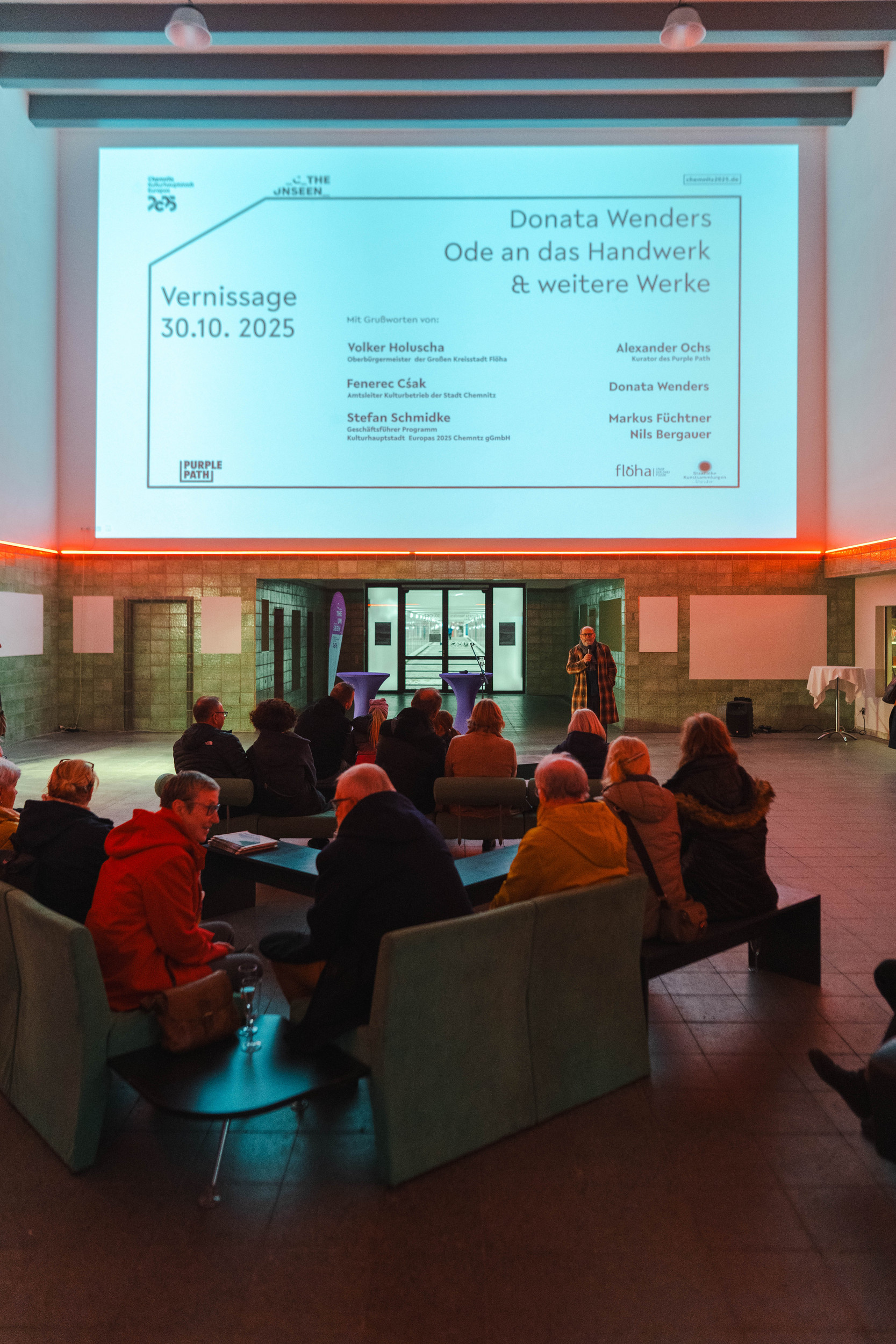 Eine Ausstellung im Kunstbahnhof Flöha widmet sich filmischen Werken von Donata Wenders. Im Mittelpunkt der Schau steht eine Reihe von elf Kurzfilmen, die traditionelle Handwerke in Sachsen in Szene setzt. Zwischen 2019 und 2024 reiste die Künstlerin durch Sachsen und portraitierte hier traditionelle Handwerksberufe und deren Produzent:innen. Es entstanden filmische Porträts unterschiedlicher, teilweise vom Verschwinden bedrohter Gewerke wie der Blaudruckerei, der Kunstblumenmanufaktur, der Papiermacherei oder der Bandoneonherstellung. Dabei steht in der Regel nicht das Individuum im Zentrum, sondern dessen Handwerkskunst.
